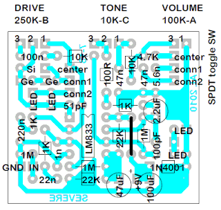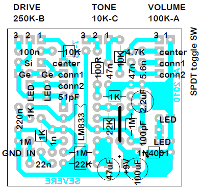 - CLIPPING selector switch, use an SPDT with CENTER OFF toggle switch same as mentioned above. Pads located between the 51pF cap and 10K resistor just above the opamp.
